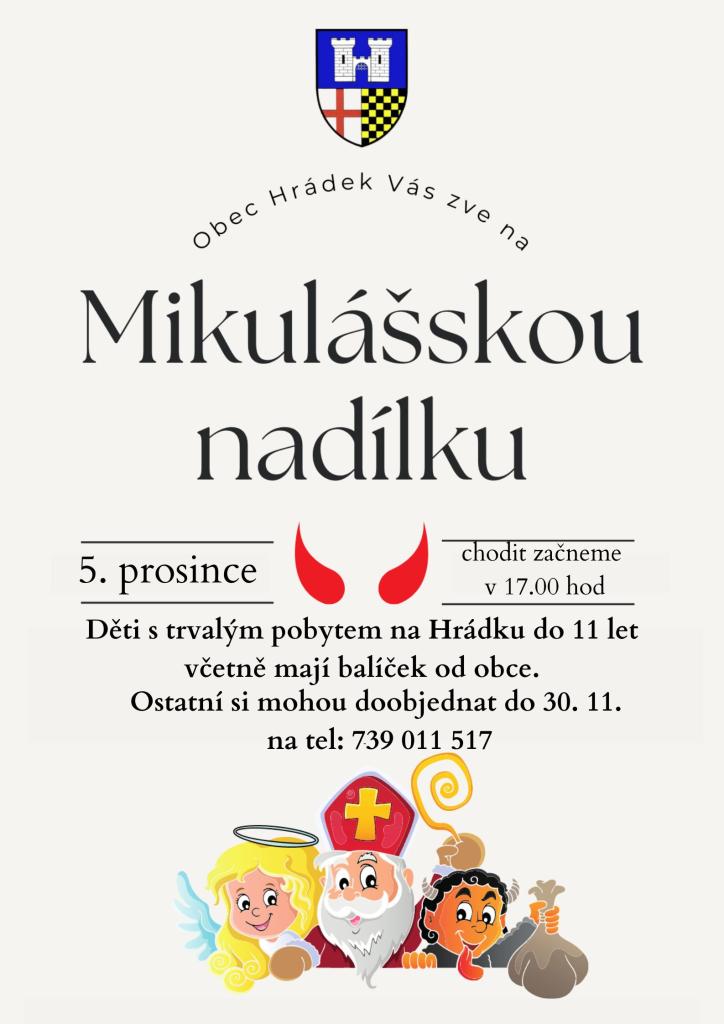 Děti do 11 let včetně s trvalým pobytem na Hrádku mají balíček od obce. Ostatní si mohou balíček doobjednat do 30.11. u Hany Ročkové na tel. 739011517.