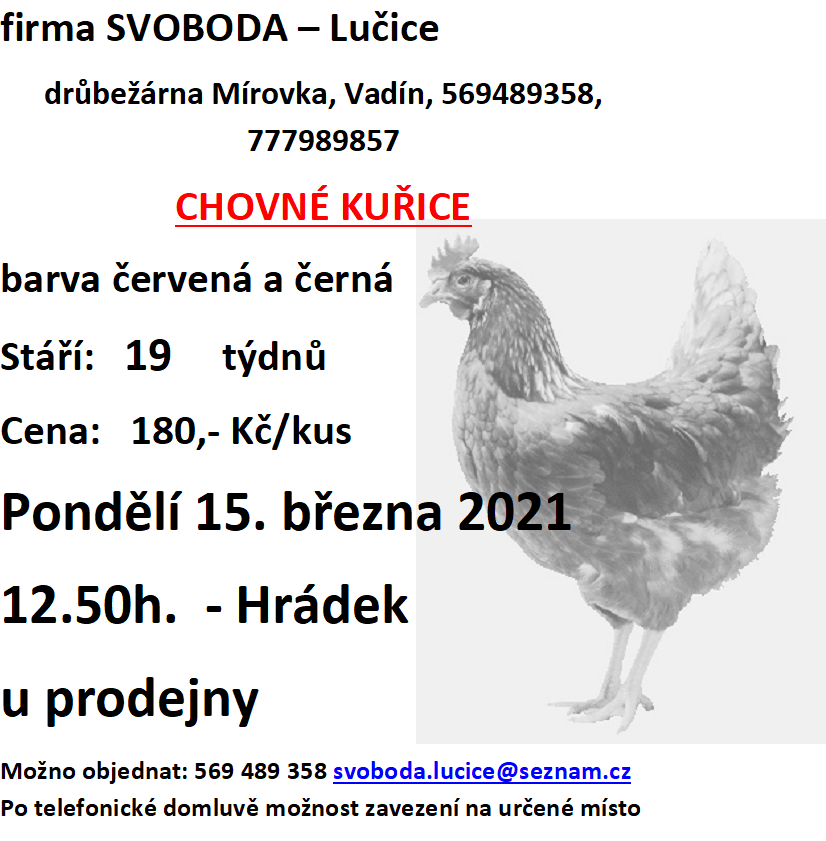 Dne 15.3. ve 12:50 prodej kuřic před místní prodejnou.