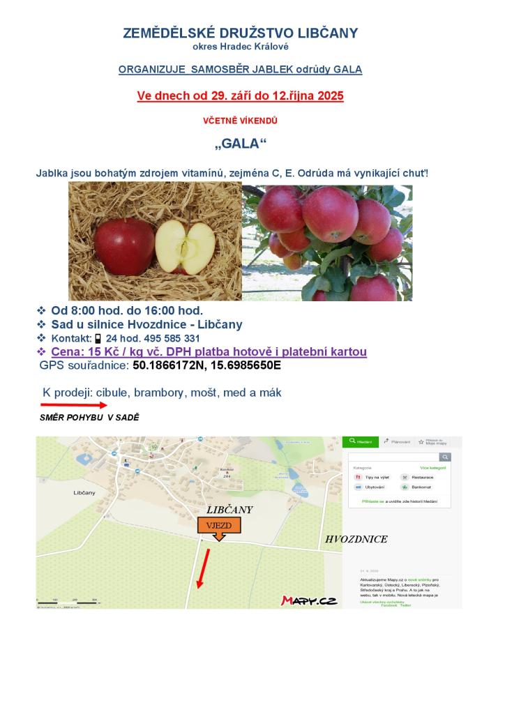 Samosběr jablek odrůdy "GALA" bude ve dnech 29.září až 12.října 2025 v čase 8:00 až 16:00 hod. v sadě u silnice Hvozdnice-Libčany. Cena za kg je 15 Kč.